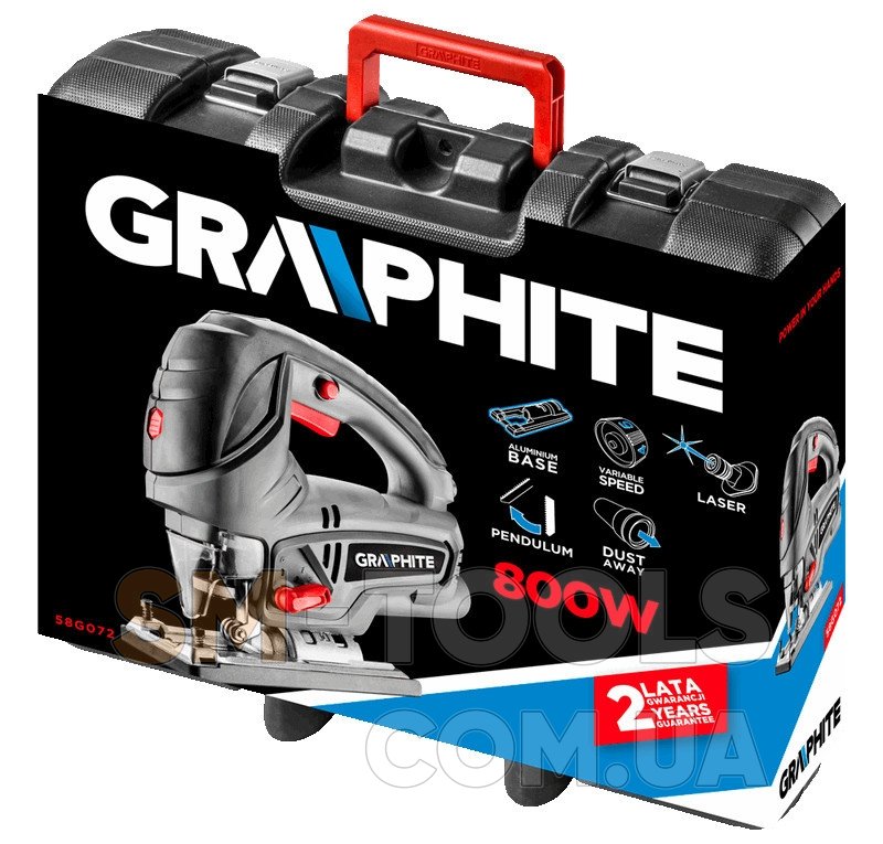 Сетевой лобзик высокого класса GRAPHITE (арт. 58G072) мощностью 800 Вт, предназначен для точной и быстрой резки металла, древесины и пластмасс толщиной 80 мм и 10 мм соответственно. Система регулировки частоты позволяет электроинструменту работать с частотой от 500 до 3000 ходов в минуту. Лобзик оснащен алюминиевой рабочей подошвой с регулировкой угла наклона в диапазоне от 0° до 45° вправо и влево, в задней части подошвы находится отсек для запасных пильных полотен. Лобзик оснащен функцией 3-ступенчатой регулировки маятникового движения, позволяющей увеличить скорость резки в некоторых материалах. Работу облегчает лазерное устройство, которым оснащен лобзик, а также безинструментальная система замены пильных полотен. Пильное полотно лобзика (ход 20 мм) предохранено прозрачным защитным экраном, изготовленным из прочного поликарбоната.