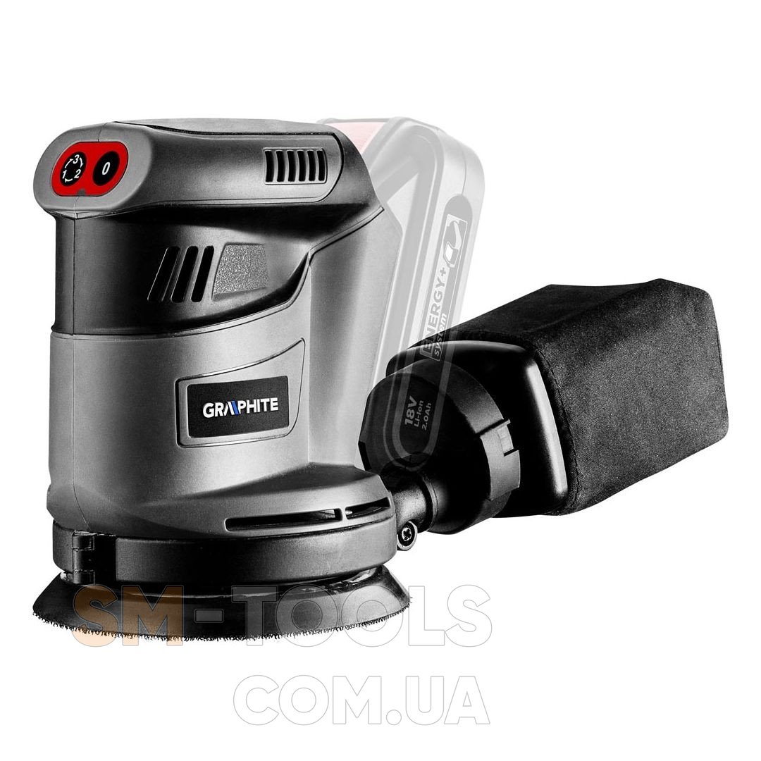 Эксцентриковая шлифовальная машина GRAPHITE, работающая с аккумуляторными батареями 18 В Li-Ion GRAPHITE Energy+. Шлифовальная машина с подошвой диаметром 125 мм, с возможностью крепления шлифовальной бумаги на липучку. Электроинструмент работает на трех скоростях: 5000/7000/9000 мин⁻¹, которым соответствует частота колебаний: 10000/14000/18000 мин⁻¹. Амплитуда колебаний составляет 2,7 мм. Область захвата покрыта антискользящим материалом, поэтому работать с электроинструментом безопасно и комфортно - в том числе и одной рукой. Шлифовальная машина оснащена эффективной системой удаления пыли, благодаря которой образующаяся в процессе шлифования пыль не усложняет работу. В набор вместе со шлифмашиной входят: емкость с матерчатым фильтром, собирающим пыль, а также шлифовальная бумага.