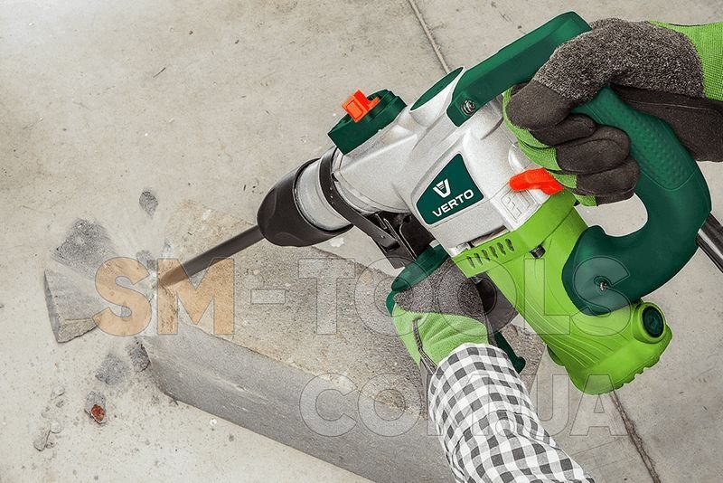 Перфоратор SDS+ 900 Вт VERTO с функцией сверления, а также сверления с ударом и долбления. Дает возможность сверлить отверстия диаметром до 40 мм в древесине, 26 мм в бетоне, а также 13 мм в стали, а энергия удара 3.5 Дж позволяет эффективно долбить бетонные стены. Перфоратор оснащен переключателем сверления с ударом/без удара/долбления, а также кнопкой непрерывного режима работы. Система SDS+ позволяет быстро закреплять рабочие принадлежности (сверла, зубила). Длинный шнур питания обеспечивает свободную работу с инструментом. Эргономичная рукоятка покрыта антискользящей накладкой, повышающей комфорт и безопасность работы. Инструмент упакован в практичный пластмассовый чемоданчик вместе с набором рабочих принадлежностей: 3 сверлами по бетону, 2 зубилами, защитой от пыли, а также емкостью для смазки. Соответствие европейским стандартам в области безопасности подтверждает сертификат CE.