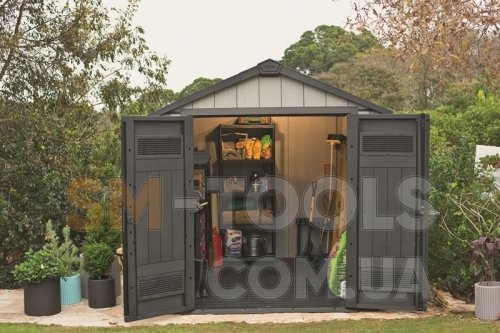 Сарай OAKLAND 757 - современное, функциональное и стильное решение для сада. Объемное внутреннее пространство позволяет устанавливать в сарае шкафы, вешалки и полки, а также хранить габаритные садовые инструменты и аксессуары. Двойные панели стен изготовлены из уникальной композиции смол, которые создают качественный материал, устойчивый к воздействию неблагоприятных внешних факторов. Крепкая крыша, которая имитирует 3D черепицу и дополнительно усилена металлом конструкция изделия обеспечивает долговечность и многолетнее использование. Безусловным преимуществом данной линейки сараев является возможность красить изделие в любой выбранный цвет.