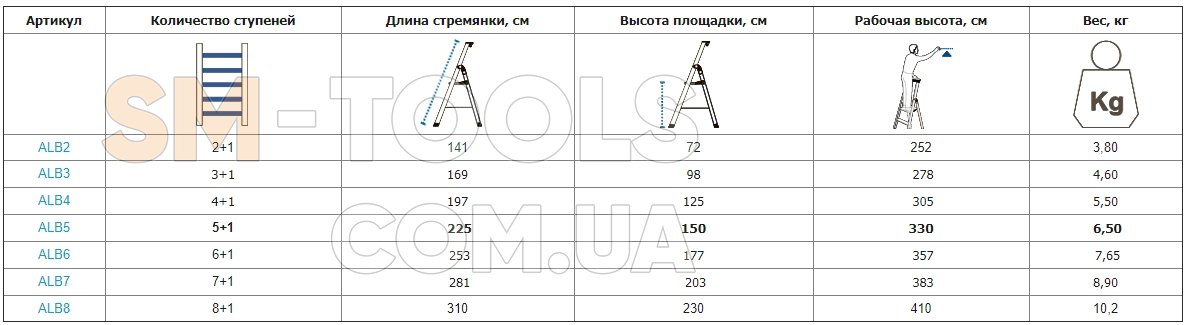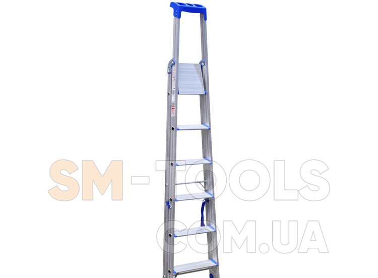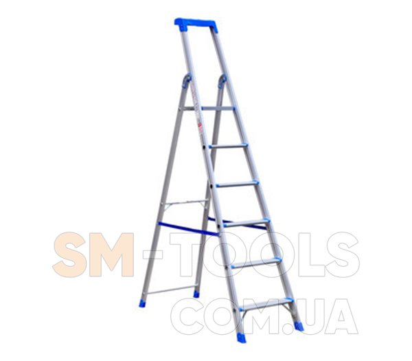 Прочная конструкция профессиональной стремянки алюминиевой VIRASTAR ALB 5+1 ступеней выдержит нагрузку 150 кг;