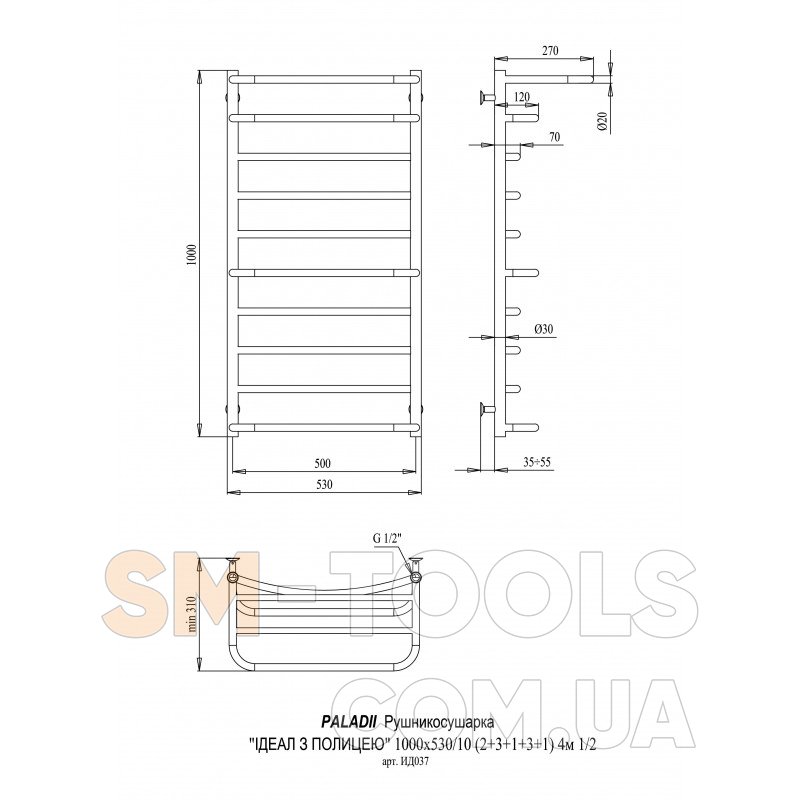 Полотенцесушитель PALADii Идеал с полкой 1000х530/10 ИД037