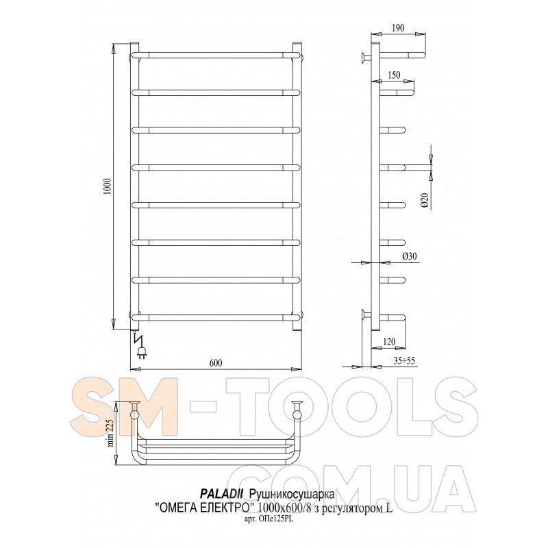 Полотенцесушитель PALADii Омега Электро 1000х600/8 ОПе125РL
