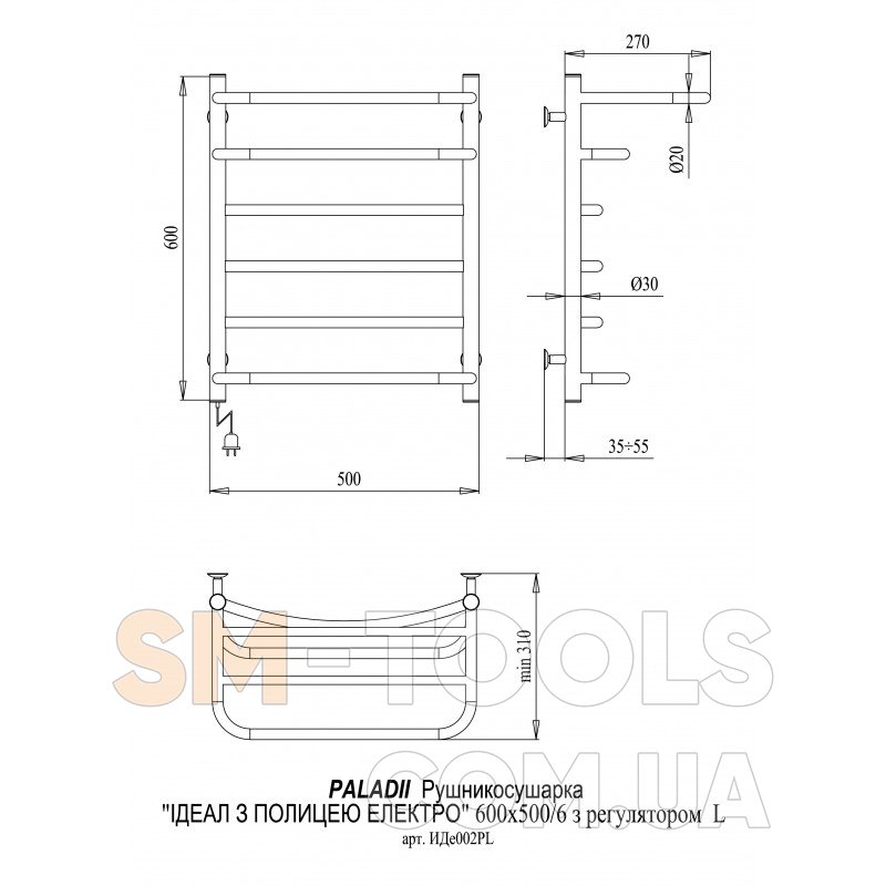 Полотенцесушитель PALADii Идеал с полкой Электро 600х500/6 ИДе002РL