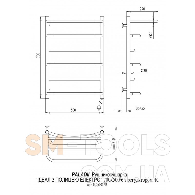 Полотенцесушитель PALADii Идеал с полкой Электро 700х500/6 ИДе003РR