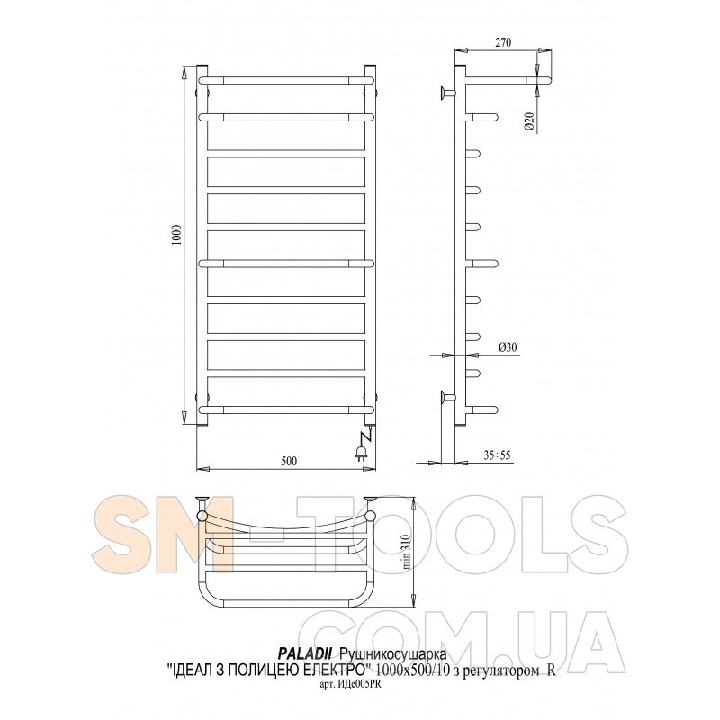 Полотенцесушитель PALADii Идеал с полкой Электро 1000х500/10 ИДе005РR