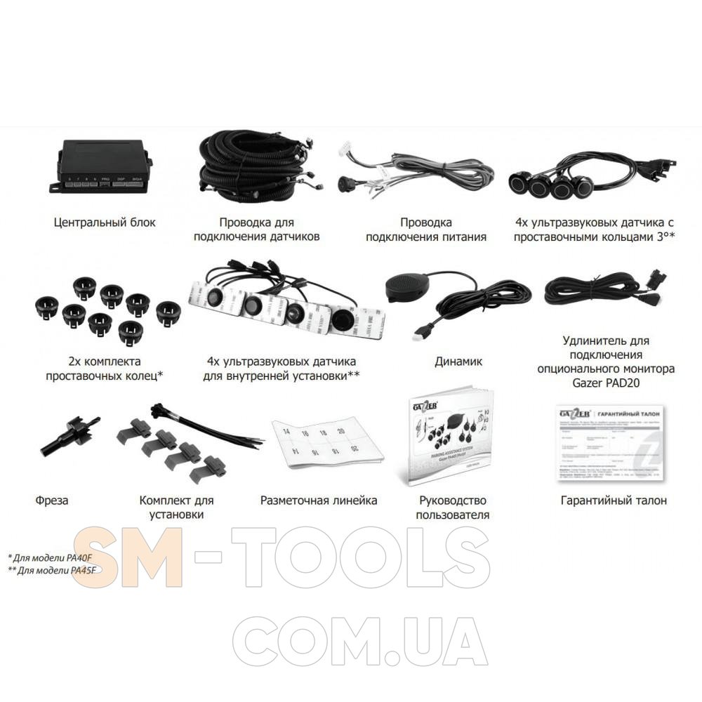 Комплект парковочной системы Gazer PA45F предназначен для профессиональной установки и включает в себя центральный блок управления, 4 датчика с креплениями для внутренней установки, динамик, три комплекта сменных адаптеров, комплект проводки с кнопкой принудительной активации, а также специальную фрезу, линейку для разметки бампера, инструкцию по установке и настройке.