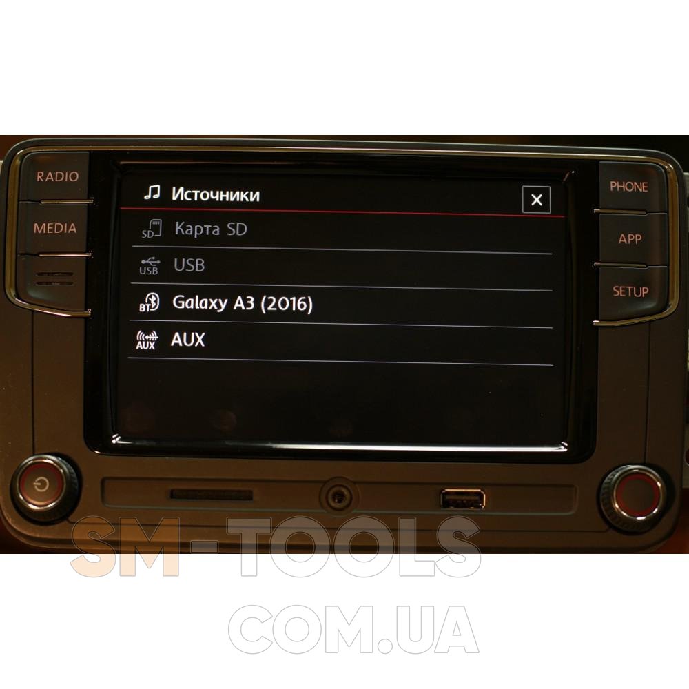 Воспроизведение медиа-файлов происходит при нажатии кнопки MEDIA. Доступны следующие источники: USB-носитель и SD-карта (до 64 Г), AUX, Bluetooth-аудио. При воспроизведении на экран выводятся теги на русском или английском языке.