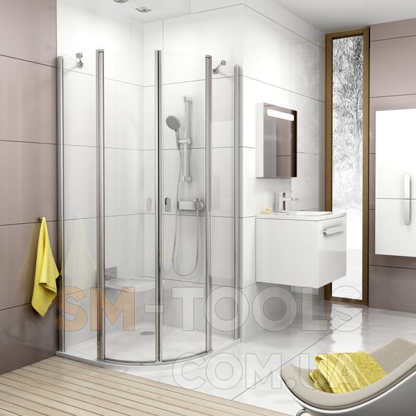 Изделие устанавливается в облицованный кафелем угол ванной комнаты на поддоны RAVAK RONDA, ELIPSO, ELIPSO PRO, ELIPSO PRO FLAT, ELIPSO PRO CHROME или непосредственно на пол со встроенным душевым каналом или трапом. В комплектацию изделия входят 2x металлических держателя. Радиус 500 мм.