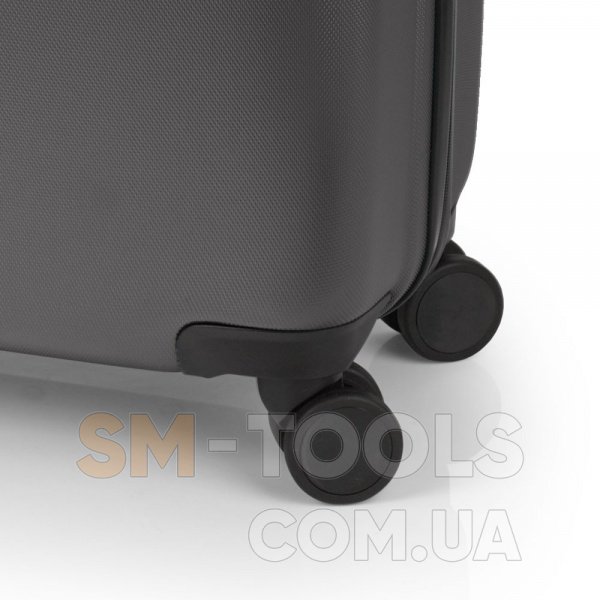 Чемодан оснащен четырьмя полноповоротными колесами с возможностью независимого разворота каждого колеса на 360 °. Системой предусмотрено равномерное перераспределения нагрузки на каждое колесо, что в свою очередь способствует плавному качению и маневренности чемодана, прилагая при этом минимум усилий. Колеса изготовлены из высокотемпературного термопластичного полиуретана (TPU). Материал обладает прочностью сравнимой с пластиком, гибкостью силикона, а так же имеет повышенную устойчивость к перепадам температур. Отличительной особенностью колес из TPU материала является снижение шума до минимума при качении чемодана по неровной поверхности. Благодаря устойчивости к истиранию материал колес отличается длительным сроком эксплуатации.
