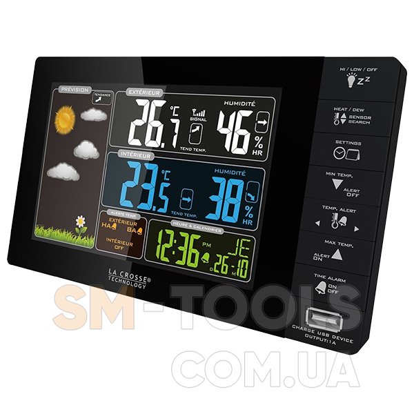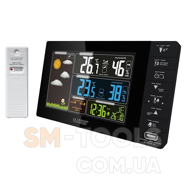 Метеостанция с контрастным цветным ЖК-дисплеем, прогнозом погоды на ближайшие 12 часов, измерением внутренней и внешней температуры и относительной влажности и USB-портом для зарядки мобильных устройств.