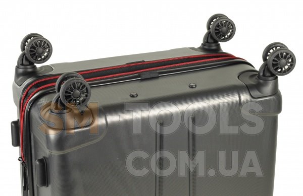 Чемодан оснащен четырьмя полноповоротными спаренными колесами с возможностью независимого разворота каждого колеса на 360°. Системой предусмотрено равномерное перераспределения нагрузки на каждое колесо, что в свою очередь способствует плавному качению и маневренности чемодана, прилагая при этом минимум усилий.