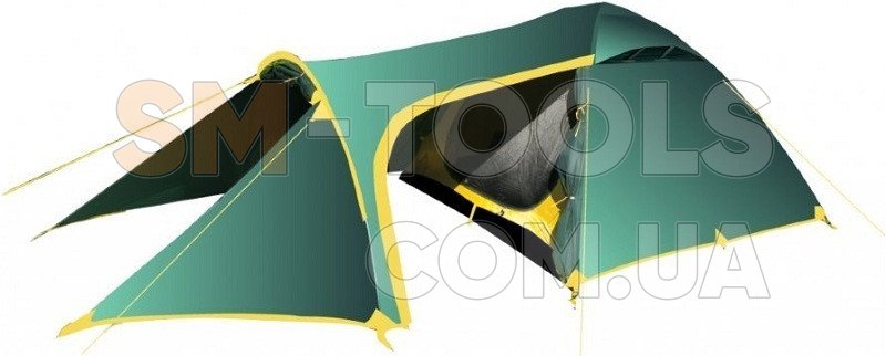 Двухслойная, 2-местная палатка Tramp Grot с тремя входами. У палатки удлиненный тамбур с двумя входами. Палатка имеет 3 вентиляционных клапана с регулируемой по высоте стойкой.