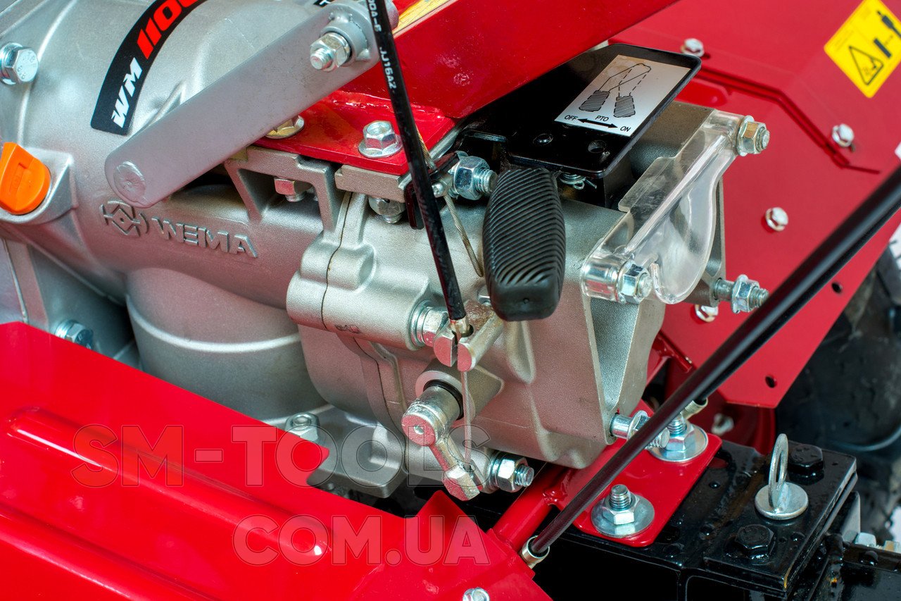 Многодисковое сцепление в масляной ванне и профессиональный шестеренчатый редуктор – это очень надежная деталь мотоблока, необходимая для работы на разных почвах. Мотоблок WEIMA WM1100A комплектуется наборными фрезами (3+1) шириной захвата 110 см, может работать с широким спектром навесного оборудования, в том числе и роторной сенокосилкой WEIMA 1100-6, работающей от вала отбора мощности. Коса была специально сконструирована под этот мотоблок и имеет свои передаточные числа для безупречной работы на второй скорости. Кроме того, выполнять покос травы с целью заготовки сена можно, используя транспортировочную телегу. Но и это не все, модель универсальна ― с помощью мотоблочной лопаты, может производить снегоуборочные работы. Имеет колеса с пневматическими шинами, обеспечивающие безупречную проходимость.
