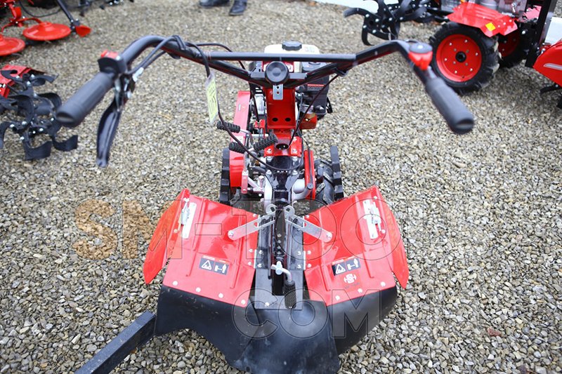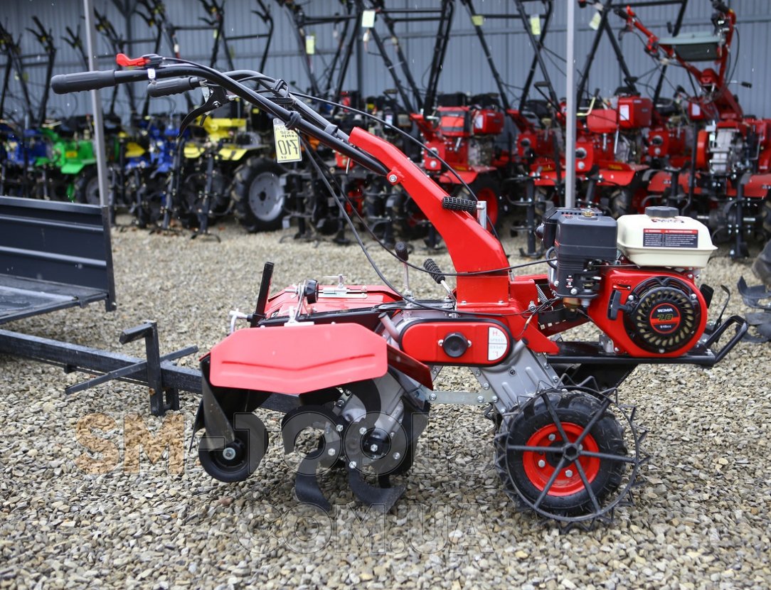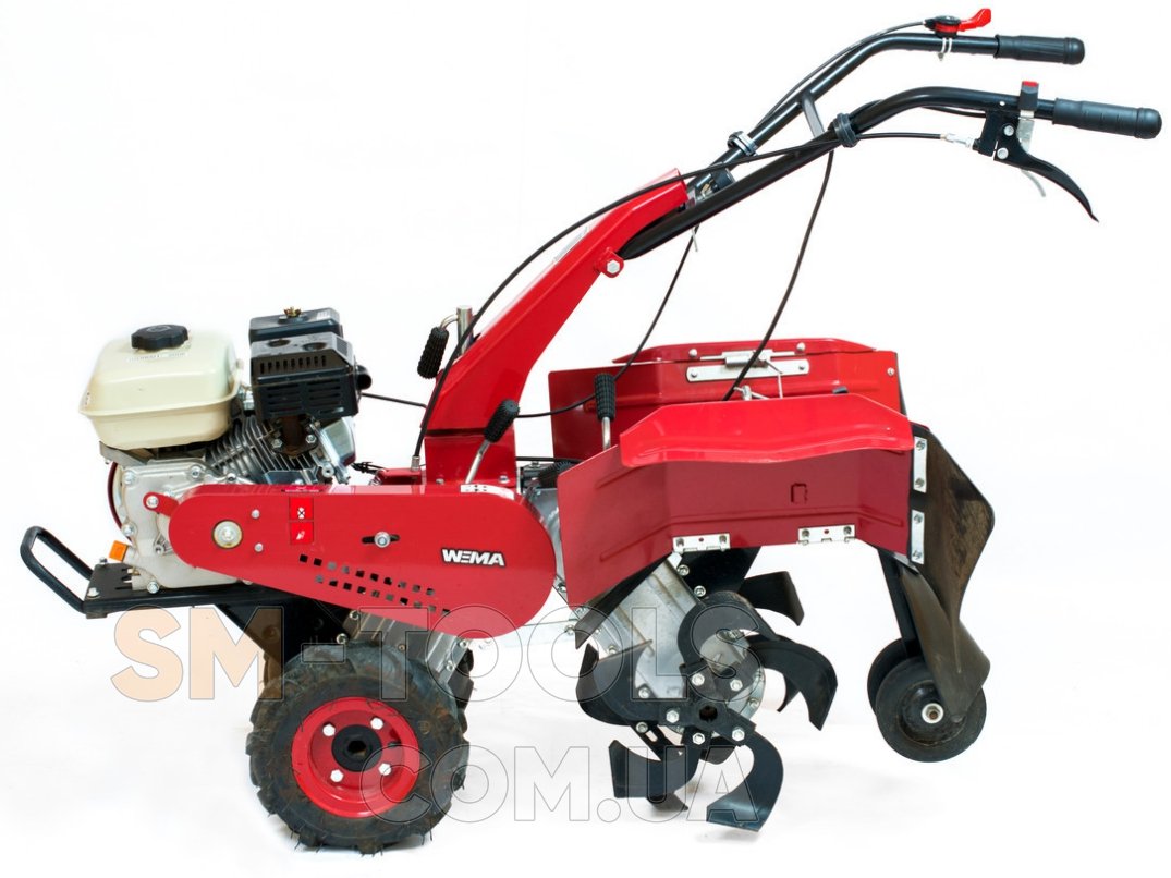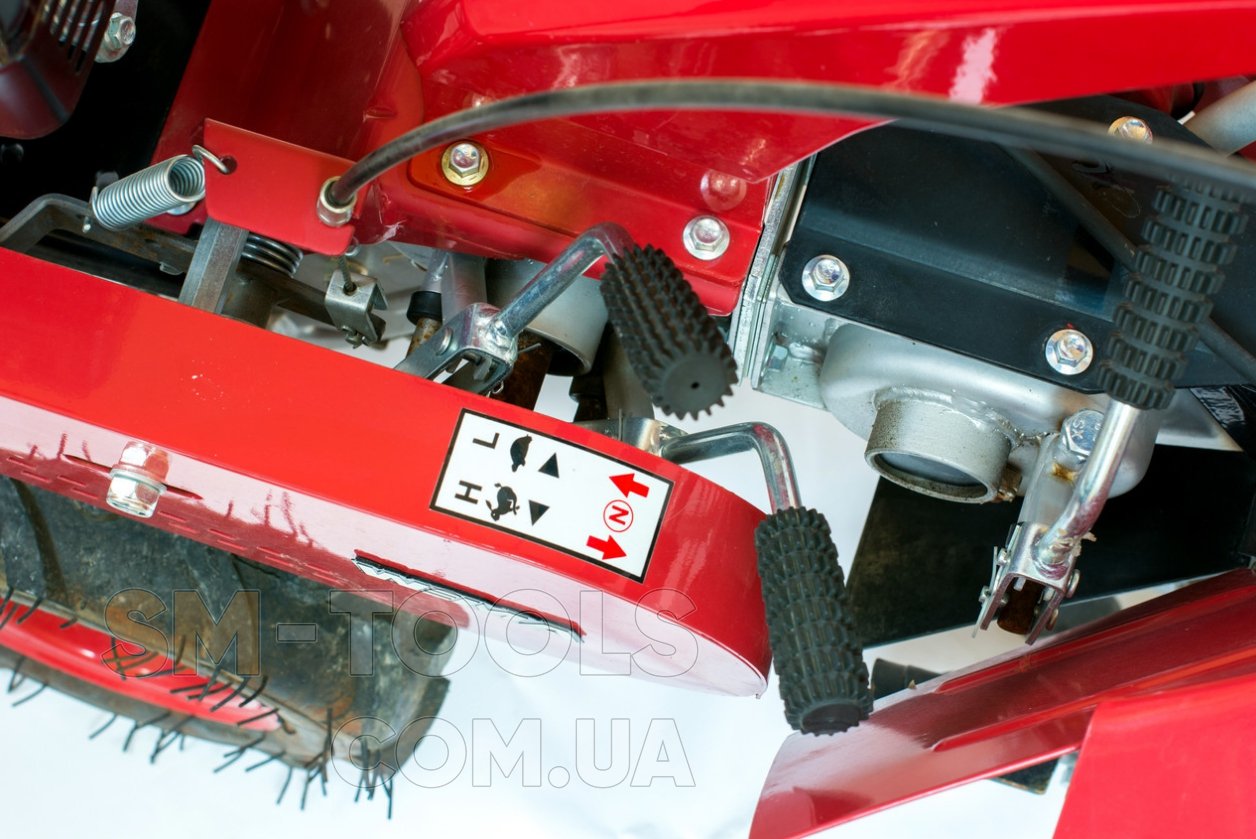 На мотоблоке установлен бензиновый двигатель WM170F-l c редуктором, сцепление ременное. Редуктор привода колес, как и редуктор привода активной фрезы, – цепной, полностью разборный. Коробка передач имеет 2 скорости вперед и 2 назад. Активная фреза тоже имеет 2 скорости. Привод на фрезу осуществляется через редукторный переходник, который можно развернуть, изменив передаточное соотношение.