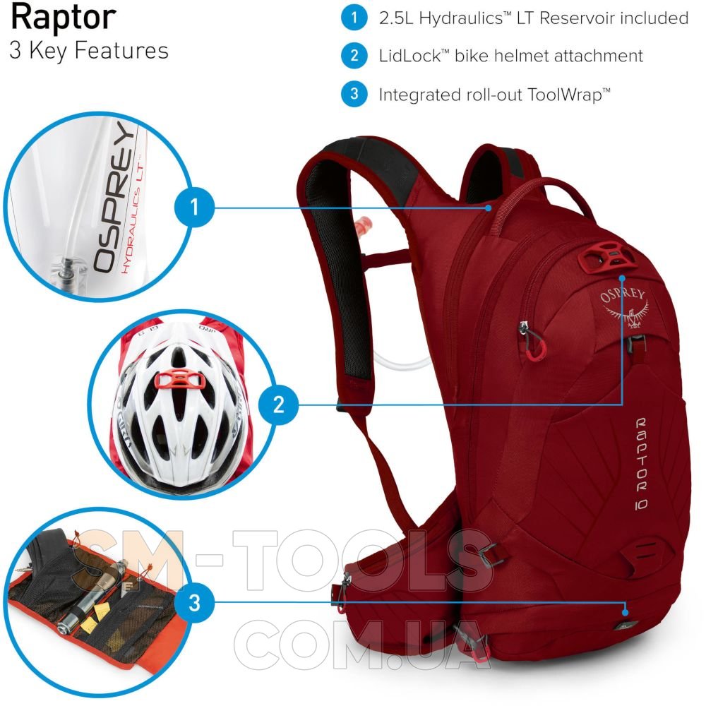 Мужской велосипедный рюкзак Osprey Raptor 10 имеет встроенный резервуар 2.5 L HydraulicsТМ LT и удобный доступ к воде, благодаря пряжке с магнитом на грудной стяжке, которая фиксирует клапан питьевой системы. Эргономичная конструкция спинки AirScapeТМ с эффективной вентиляцией обеспечивает максимальное удобство и комфорт даже в жарких условиях с высокой влажностью. Удобные плечевые лямки в сочетании с широким бедренным поясом BioStretchТМ, обеспечивают идеальную посадку и препятствуют смещению рюкзака во время интенсивной езды. Грудную стяжку можно закрывать/открывать одной рукой, не отвлекаясь от дороги, благодаря инновационной системе застежки с магнитной пряжкой. Кроме того, рюкзак Raptor 10 оснащен вместительным основным отделением, нижним отсеком с органайзером ToolWrapТМ для хранения велосипедных запчастей в отдельном месте, несколькими удобными карманами спереди и на бедренном поясе, чтобы все необходимые вещи всегда были под рукой, а также надежным креплением для велосипедного шлема LidLock.