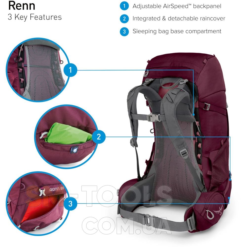 Женский рюкзак Osprey Renn 65 с простым прогрессивным дизайном и удобной системой подгонки, представляет собой инновационную модель, разработанную для обеспечения высокого уровня комфорта и идеальной посадки. Он имеет регулируемую конструкцию спинки с подвесной сеткой AirSpeed, которая гарантирует отличную вентиляцию. Широкий набедренный ремень обеспечивает максимальный комфорт даже во время переноса большого веса. Osprey Renn 65 имеет вместительное основное отделение, с верхней и нижней точкой доступа через отсек для спального мешка, функциональный верхний клапан, а также большое количество карманов и креплений для обеспечения быстрого доступа к необходимому во время похода снаряжению. Он совместимый с моделями Osprey Daylite & Daylite Plus, что позволяет не только увеличить полезный объем, но и дает возможность оставлять большой рюкзак в лагере и отправляться в непродолжительные походы с компактным городским рюкзаком.