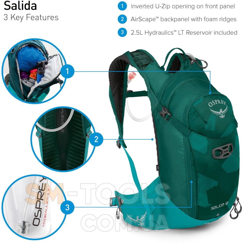 Женский велосипедный рюкзак Osprey Salida 8 имеет стильный прогрессивный дизайн и прочную сбалансированную конструкцию с впечатляющими организационными возможностями. Задняя панель AirScapeТМ с большим воздушным каналом, способствует эффективной циркуляции воздушного потока, несмотря на плотное прилегание рюкзака к телу. Благодаря удобным плечевым лямкам и съемному набедренному поясу, он всегда идеально сидит на спине, независимо от того как быстро приходится крутить педали. Модель оснащена интегрированным резервуаром 2.5L Hydraulics, а также креплением с магнитом на грудной стяжке, которое фиксирует клапан питьевой системы, обеспечивая легкий и быстрый доступ к воде во время катания. Кроме того, пряжка с магнитом на грудной стяжке позволяет открывать и закрывать ее одной рукой, не отвлекаясь от дороги. Osprey Salida 8 имеет большое основное отделение с несколькими карманами для удобной организации вещей и большой U-подобной молнией, которая позволяет широко открывать рюкзак и облегчает процесс упаковки/распаковки.