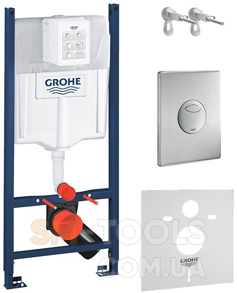 Инсталляционный набор Rapid SL 4 в 1 38862SD1 от GROHE состоит из крепежной рамы 38840000 с бачком для подвесного унитаза GD2, 6/9 л (заводские настройки: 3/6 л), пластиковой панели смыва Skate 38862SD0 в цвете нержавеющей стали, звукоизолирующей панели 37131000, комплекта для крепления инсталляции 3855800M и крепежных элементов.