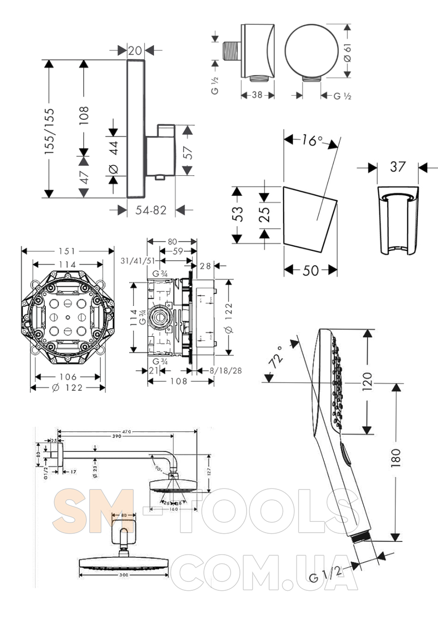 Состав душевого комплекта Настенный держатель, Встраиваемый смеситель, Верхний душ, Ручной душ