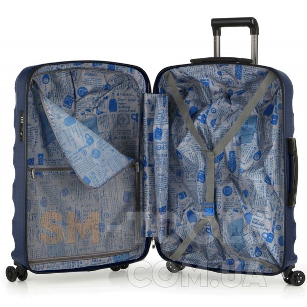 - Чемодан разделен перегородкой на молнии на два основных отделения, перегородка имеет дополнительные карманы на молниях