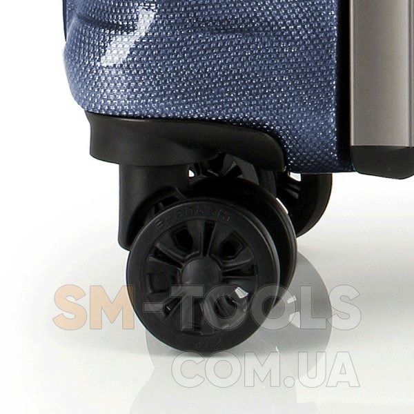 Чемодан оснащен четырьмя полноповоротными, спаренными колесами с возможностью независимого разворота каждого колеса на 360°. Системой предусмотрено равномерное перераспределения нагрузки на каждое колесо, что в свою очередь способствует плавному качению и маневренности чемодана, прилагая при этом минимум усилий.