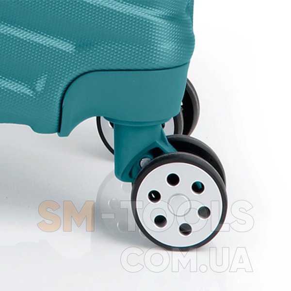 Модель оснащена четырьмя полноповоротными, спаренными колесами с возможностью независимого разворота каждого колеса на 360°. Системой предусмотрено равномерное перераспределения нагрузки на каждое колесо, что в свою очередь способствует плавному качению и маневренности чемодана, прилагая при этом минимум усилий.