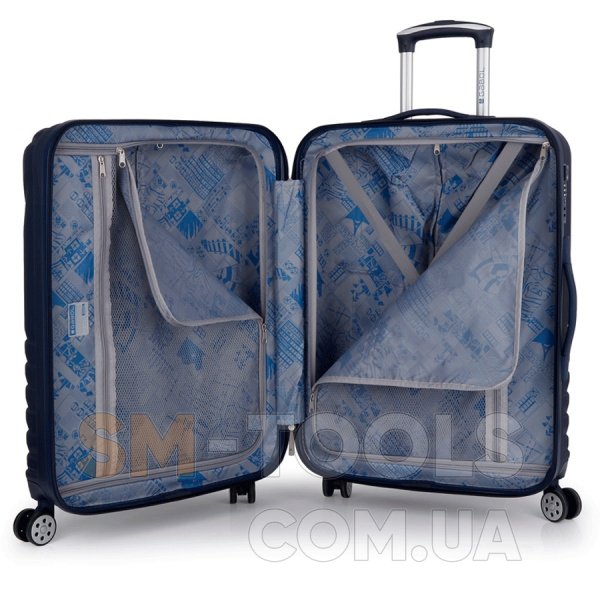 - Чемодан разделен перегородкой на молнии на два основных отделения, перегородка имеет дополнительные карманы на молниях