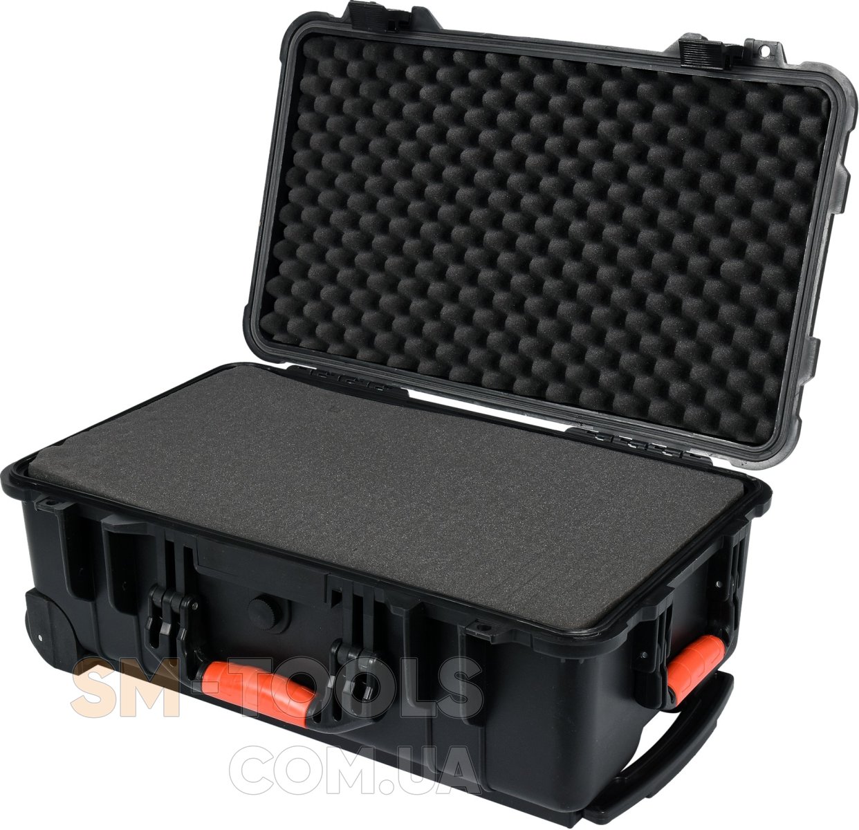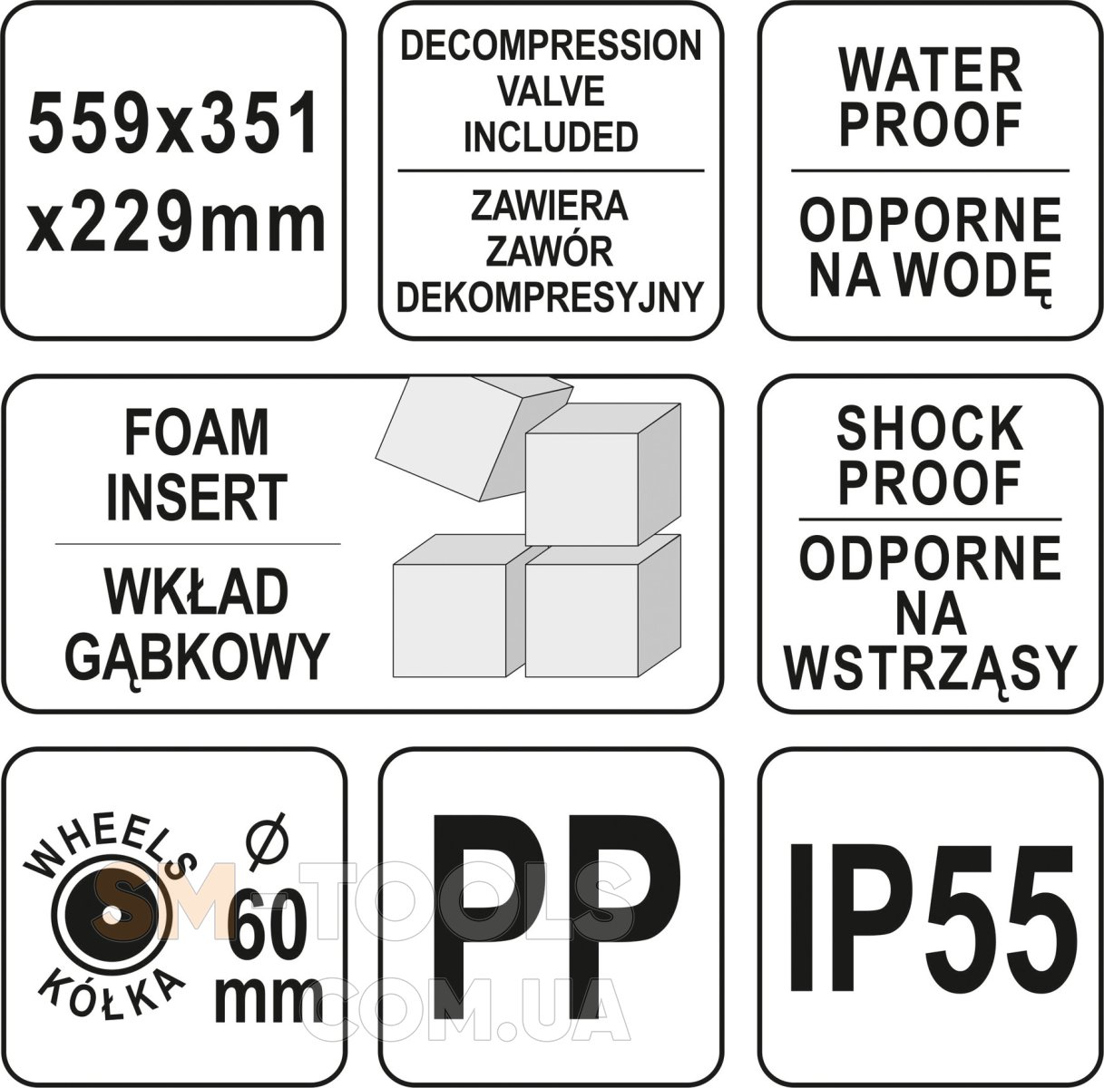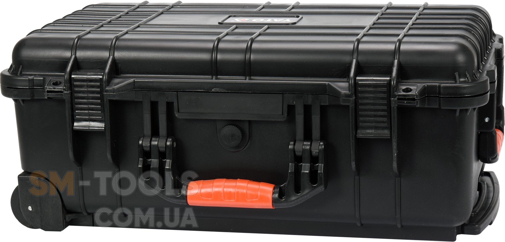 Ящик для инструментов YATO YT-08905 - плотный, водостойкий, пыленепроницаемый и ударопрочный герметичный чемоданчик, предназначен для хранения инструментов, фотографического и измерительного оборудования. Оснащен декомпрессионным клапаном. Изготовлен из гибкого полипропилена согласно классу защиты IP55. Внутренняя часть чемодана заполнена предварительно разрезанной губкой, подготовленной для независимого моделирования выемок для конкретных продуктов. Идеально подходит как транспортный контейнер.