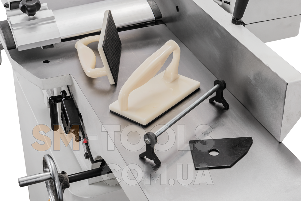 Оба стола регулируются по высоте при помощи винтовых механизмов, приводимых в действие ручками-маховиками. Перемещением подающего (переднего) стола устанавливают глубину строгания, для чего есть соответствующая разметка; принимающий (задний) регулируют только во время обслуживания станка при наладочных операциях. Упор заготовки чугунный, с механизмом наклона (он возможен в обе стороны). Фиксация выбранного положения производится резьбовым зажимом. Ножевой вал укомплектован тремя ножами, допускающими повторную заточку. Их типоразмер и ассортимент такой же, как и у профессиональных фуганков Jet с аналогичной шириной строгания.