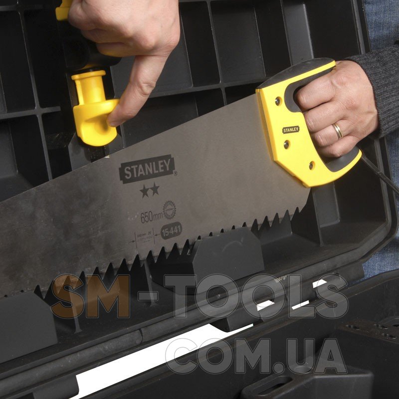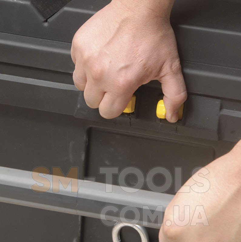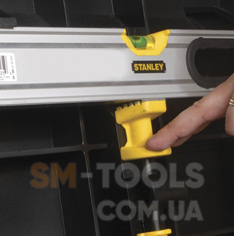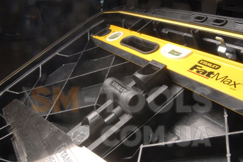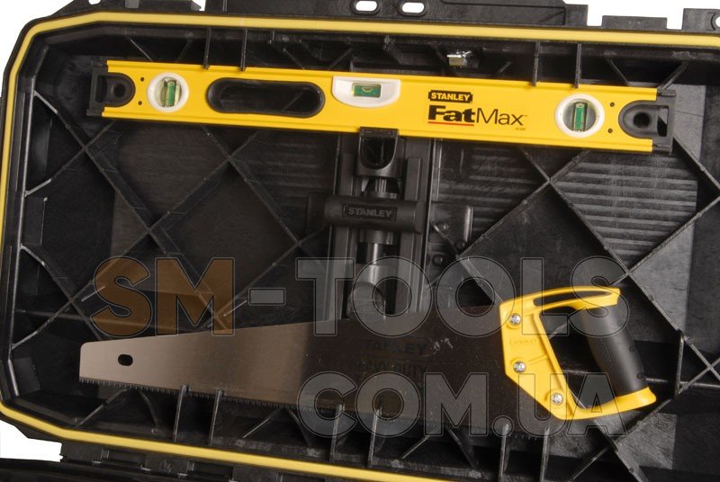 Специальные крепежные элементы на внутренней стороне крышки позволяют разместить длинные инструменты, такие как ножовка или уровень