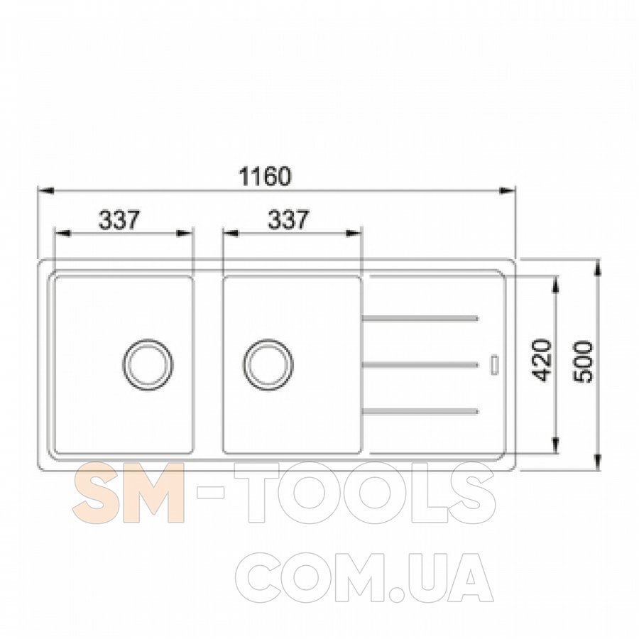 Franke Basis BFG 621 - прямоугольная кухонная мойка с крылом. Есть две одинаковые по размеру чаши 337x420x200 мм. Размер мойки составляет 1160х500 мм.