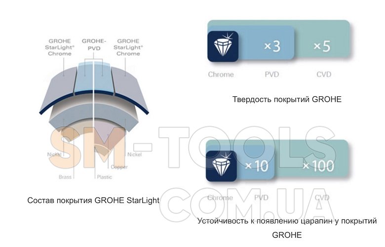 Покрытие, выполненное по запатентованной технологии GROHE, обеспечивает повышенную износостойкость и бриллиантовый блеск.