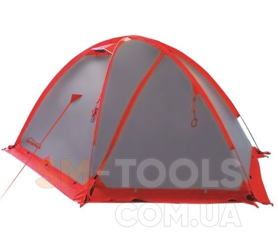 Двухместная экспедиционная палатка Tramp Rock 2 (V2) c двумя входами и двумя тамбурами. Три внешние дуги обеспечивают исключительную устойчивость палатки к сыльным ветру, снегу и дождю. Преимущество использования в конструкции палатки внешних дуг : Удобство установки во время дождя (сначала ставится тент, а затем под прикрытием пристегивается внутренняя палатка, которая остается сухой). Возможность значительно быстрее складывать и ставить сухую палатку — достаточно достать (или ввести) дуги в карманы на тенте. Конструкция палатки более ветроустойчивая, чем классическая палатка с дугами "внутри", за счет более сильного натяжения тента и жесткой фиксации дуг. Внешние дуги сильнее натягивают наружный тент, за счет чего канденсант быстрее скатывается по его внутреней поверхности, не затекает в спальный отсек. Благодоря вешнему расположению дуг пространство между слоями палатки становится больше за счет чего улучшается вентиляция и снижается количество образующегося конденсата. Снабжена снежной юбкой. Превосходные характеристики материалов, надежная конструкция, проверенная в различных условиях, прочные алюминиевые дуги — вот то, что нужно настоящему путешественнику!