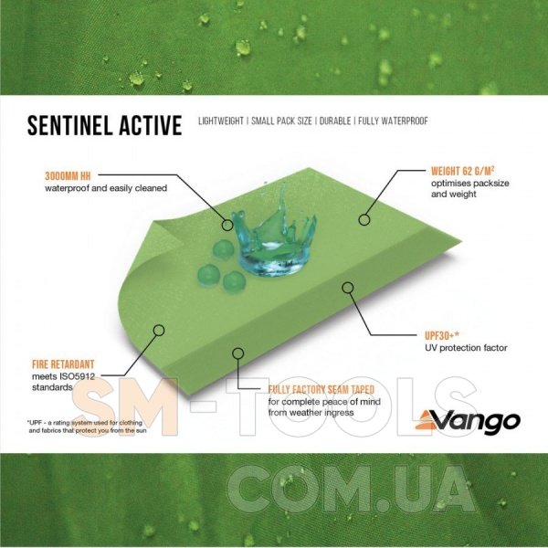 Материал покрытия: Sentinel Active, вес материала 62 г/м2, c фильтром UPF 30+, 3000 мм в.ст., проклеенные швы. Разработан эксклюзивно для Vango