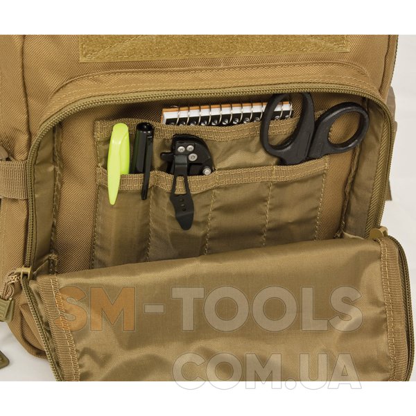 Основное отделение, съемное, может использоваться как компактная городская сумка с органайзером для переноски мелких вещей в городских условиях. Сумка надежно крепится к основной платформе рюкзака с помощью липучке Velcro и контрольного фастекса. Внутренняя часть сумки основного отделения имеет готовую платформу для крепления малых подсумков и приспособлений, оборудованных липучкой Velcro.