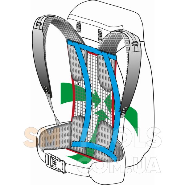 Спина: благодаря системе Dry Net System Back является полностью вентилируемой. Дополнительное воздушное пространство между спиной и рюкзаком способствует эффективной вентиляции. Валики с мягкой пенополиуретановой подкладкой обшиты дышащей сетчатой тканью.