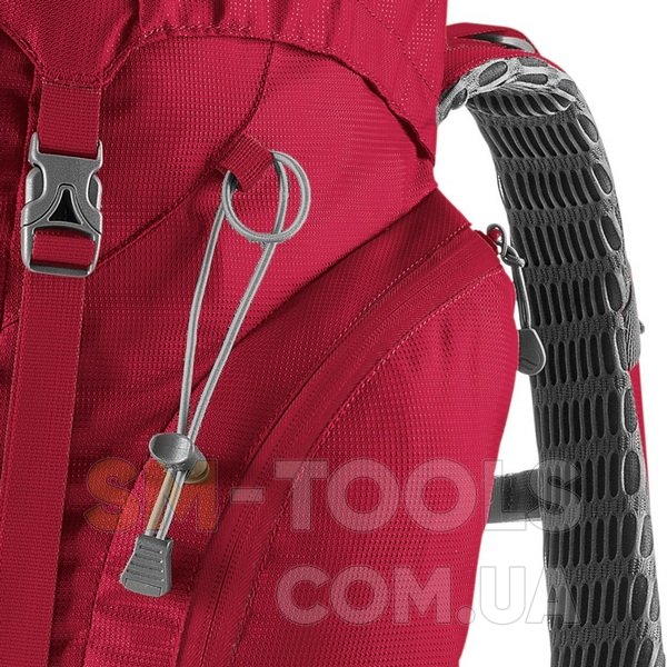 Ice-axe holders (2) - держатели для ледорубов размещаются в верхней и нижней части фасада альпинистского рюкзака и, как правило, представляют собой комбинацию нижних длинных петель или усиленных шнуров и верхних стяжных эластичных шнуров с фиксатором или небольших стяжек на текстильной застежке velcro. Такие держатели позволяют надежно фиксировать ледорубы и не загружать ими внутреннее пространство рюкзака. При необходимости держатели могут быть использованы и для крепления треккинговых палок. Данный рюкзак имеет две пары креплений для ледоруба, совмещенных с креплениями для треккинговых палок