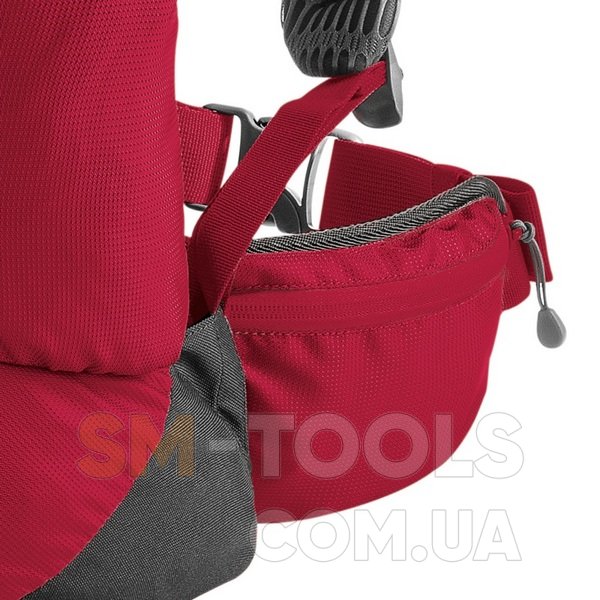 Trekking poles holders (2) - держатели для треккинговых палок размещаются в верхней и нижней части фасада треккингового рюкзака и, как правило, представляют собой комбинацию нижних петель и верхних стяжных эластичных шнуров с фиксатором. Реже нижние петли заменяются такими же стяжными шнурами. Такие держатели позволяют надежно фиксировать треккинговые палки и не загружать ими внутреннее пространство рюкзака. Данный рюкзак имеет две пары креплений для треккинговых палок, совмещенных с креплениями для ледорубов.