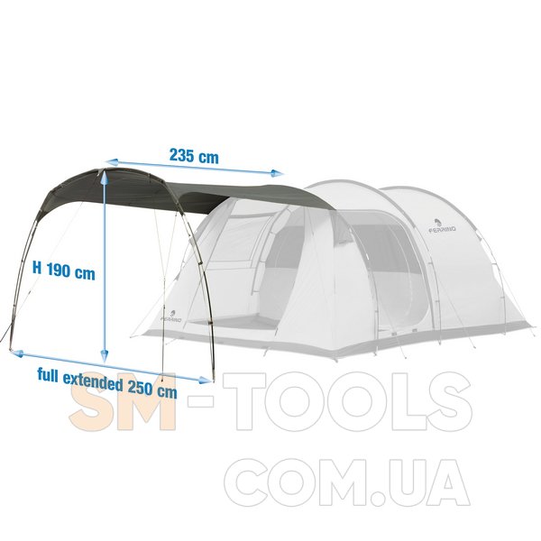 Тент Ferrino Canopy Grey предназначен для увеличения жилого пространства кемпинговых палаток туннельного типа и подходит не только к палаткам Ferrino, но и к другим палаткам аналогичной конструкции, ширины и высоты. Тент имеет универсальное крепление к палатке, оснащен двухточечными оттяжками для повышения стабильности и натяжным шнуром. Материал имеет водозащитные и водоотталкивающие свойства, но в первую очередь главное назначение тента - это создание тени. Такая приставная веранда может использоваться для обустройства кемпинговой кухни или зоны дневного отдыха.