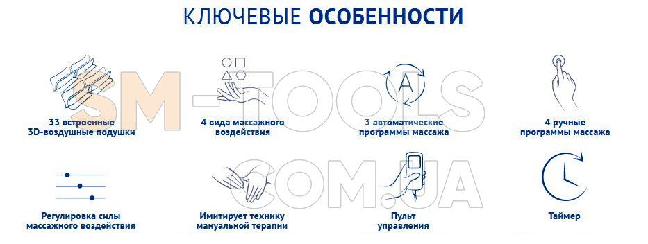 - Массаж шейного отдела позвоночника выполняется благодаря деликатной работе 7 воздушно-компрессионных массажных подушек.