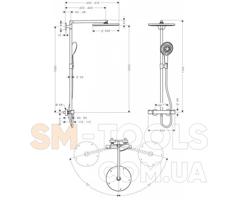Комплектация душевой стойки С ручным душем, Наружный смеситель, Без излива, С верхним душем
