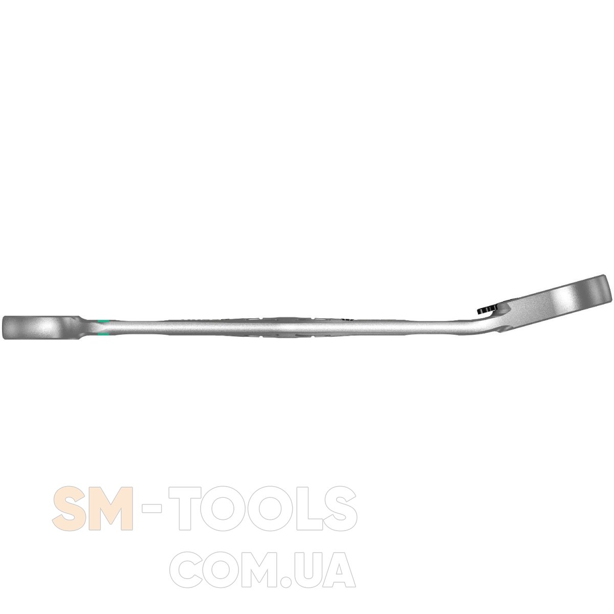 Конструкция реверсивной трещотки в накидной части ключа с необычайно тонким механизмом зацепления на 80 зубцов обеспечивает свободу работы даже в тесном пространстве. Точная даже на слух работа трещотки. Прочный стопор из двух элементов позволяет работать с экстремальными нагрузками. Наклон трещотки на 15° для уверенной работы с высокими моментами силы.