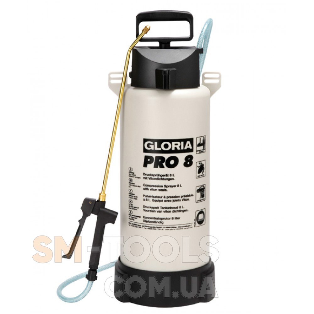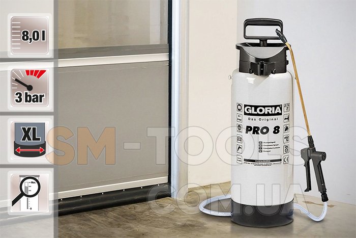 Распылитель Gloria Pro 8 - устройство для нанесения распыляемых водорастворимых строительных химикатов. Благодаря рабочему давлению 3 бар и емкости 8 литров опрыскиватель обеспечивает максимально эффективное и равномерное распыление. Опрыскиватель GLORIA Pro 8 оснащен стойкими уплотнениями из витона, а также распылительной трубкой с плоской струйной форсункой типа 8002 E.