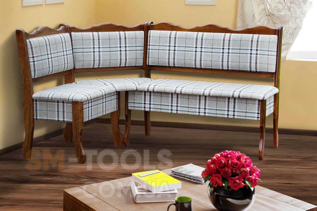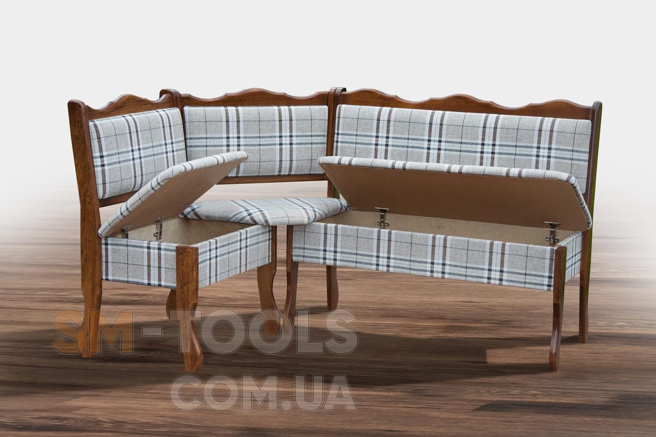 Мебель выполнена из массива бука, сидение и спинка уголка обиты прочной и практичной тканью. Уголок оборудован 2 небольшими нишами с подъемными сидениями, что особенно важно для небольших кухонь, так как это создает дополнительное место для хранения.