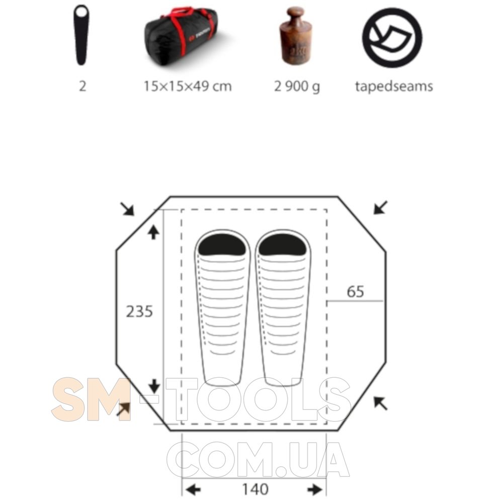 Trimm Apolos-D - функциональная палатка для двух человек. Подходит для использования в любой сезон. Благодаря четырехсекционной дюралюминиевой структуре из высококачественных износостойких материалов и деталей палатка очень стойкая (не боится порывистого ветра и дождя). Есть два симметричных входа, которые обеспечивают превосходную вентиляцию и комфорт. Палатка фиксируется с помощью высококачественных клипс ITW Nexus, которые регулируют натяжение внешнего тента. Колышки дюралюминиевые DAC насыщенного темно-красного цвета. Палатка очень легкая (всего 2,9кг), в комплекте есть компрессионная сумка для транспортировки и хранения и ремонтный набор. Она прекрасно подойдет для туристических поездок в горы и природных экспедиций.