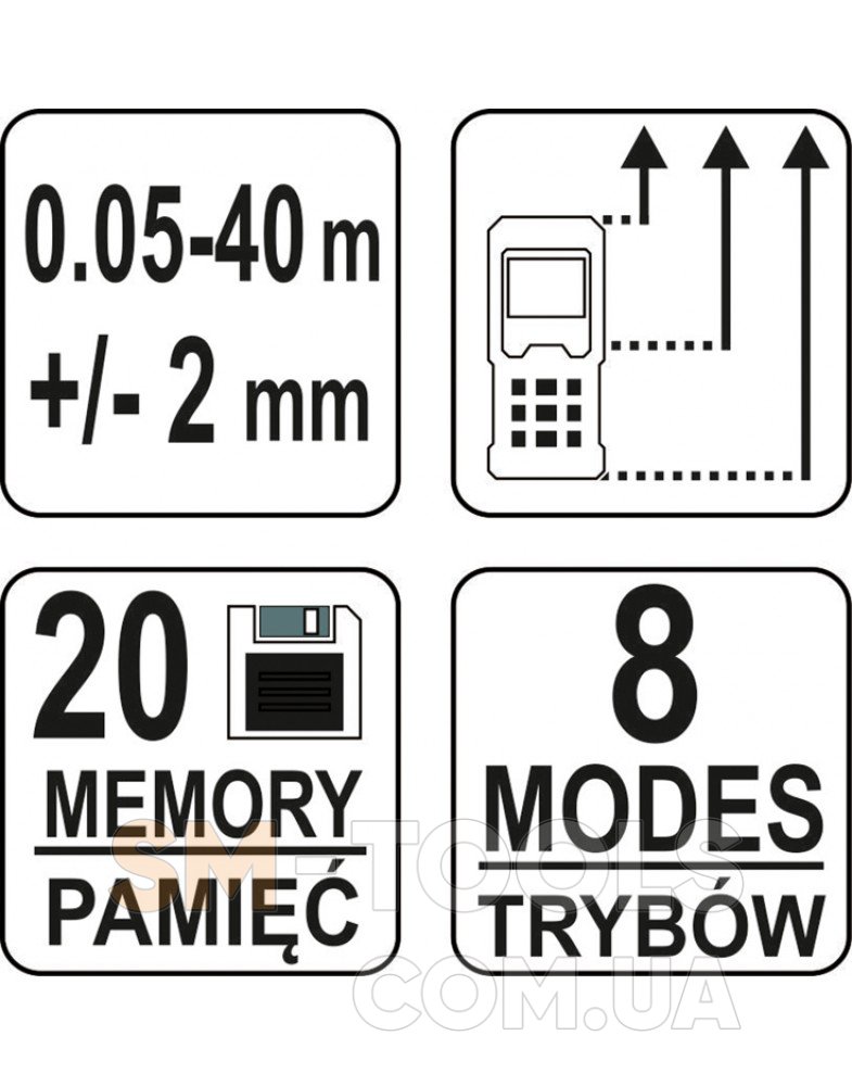 Профессиональный лазерный дальномер STHOR 81790 предназначен для точного измерения расстояний до 40 м. Он оснащен многочисленными функциями (непрерывное измерение, тригонометрические функции, основные математические операции). Быстрое измерение (0.5 с) повышает эффективность работы, в то время как возможность крепления на штативе расширяет возможности устройства. Четкий 4-строчный экран с подсветкой позволяет удобно считывать измерения во всех условиях. Кроме того, дальномер оснащен памятью последних 20 измерений. В случае сложных функций (например, при вычислении объема) устройство запомнит все три компоненты измерения, а также результат. Используется в строительстве, промышленности и других отраслях, где требуются быстрые и точные измерения.