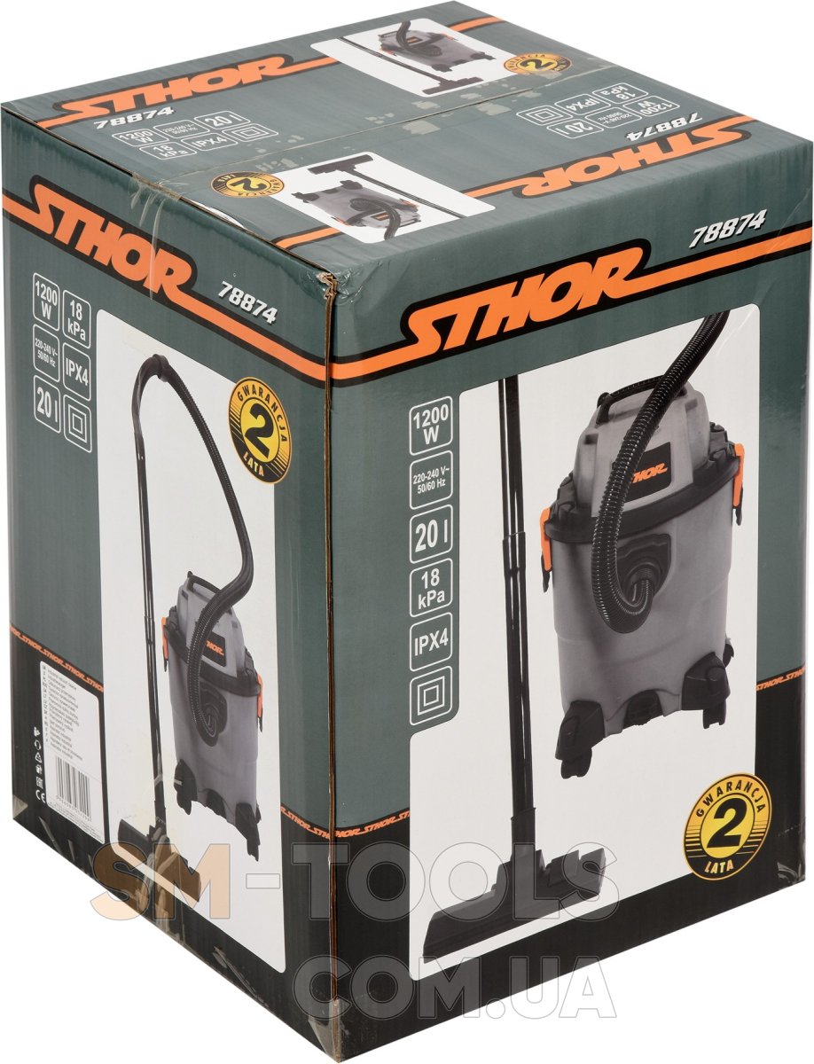 Промышленный пылесос STHOR 78874 мощностью 1200 Вт и мощностью всасывания 18 кПа. Он имеет контейнер емкостью 20 л. Пылесос используется как для сухой, так и влажной уборки. Предназначен для использования в домашних мастерских, гаражах, подвалах и автомобилях.