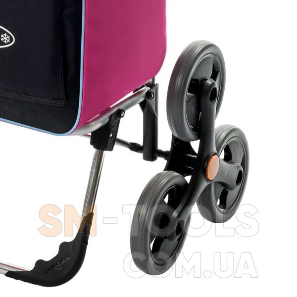 - Шасси сумки-тележки оснащено шестью колесами по три колеса в каждом блоке, напоминающие треугольник. При перемещении по ровной поверхности работает две пары колес. Третья пара необходима при подъеме по ступеньках. Когда вы тянете сумку-тележку, свободная пара колес, заезжает на следующую ступеньку, принимая тяжесть на себя.