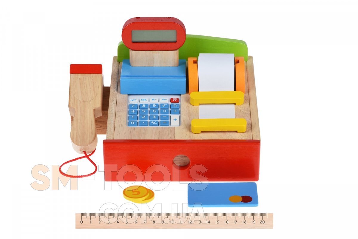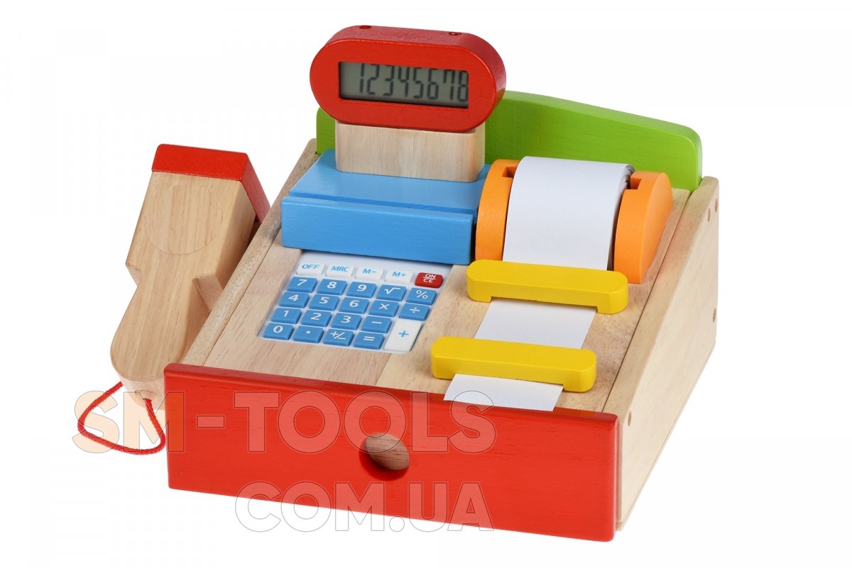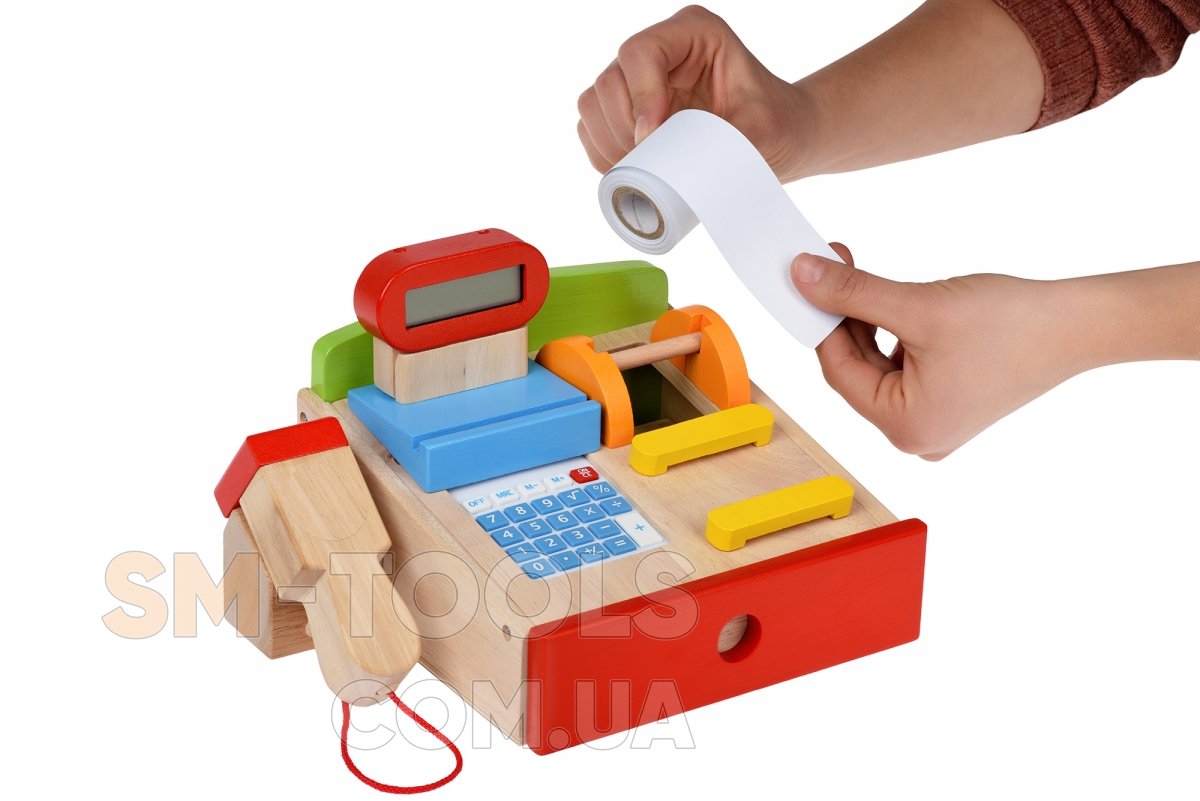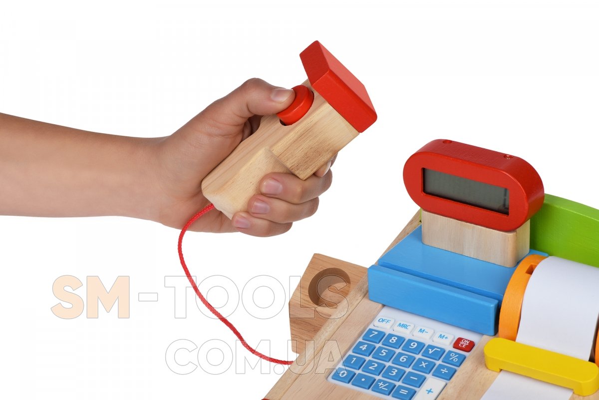 Детский игровой набор представляет собой устройство из натурального дерева в виде кассового аппарата. В набор входит прибор со встроенным калькулятором, игрушечным механизмом печати чеков и сканером штрих-кода. Также набор имеет ящик с игрушечными карточками и деньгами.